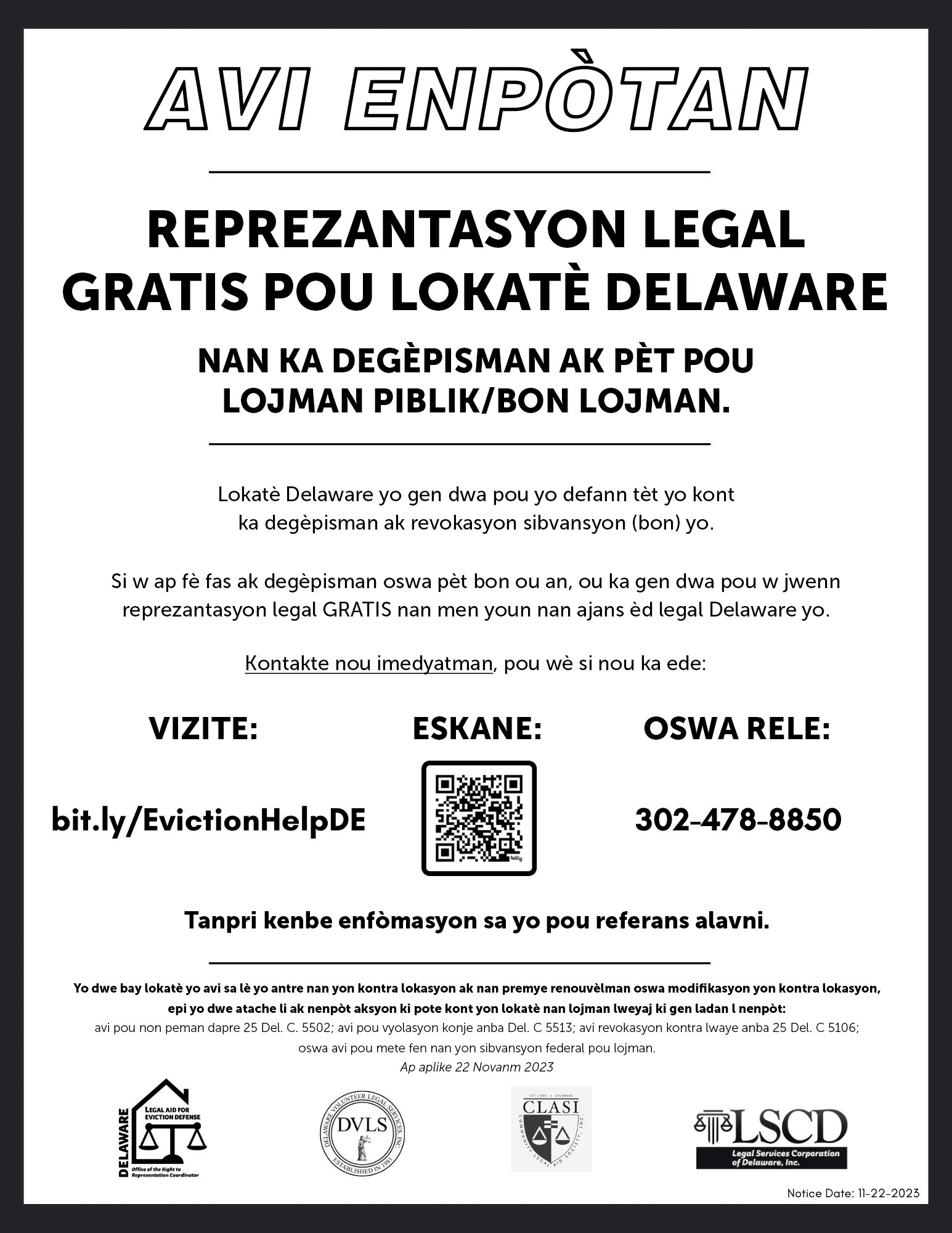 Legal representation is provided by Delaware’s three non-profit civil legal assistance organizations: Community Legal Aid Society, Inc. (CLASI), Delaware Volunteer Legal Services (DVLS), and Legal Services Corporation of Delaware (LSCD). Services are being phased in over three years, starting on November 22, 2023.
